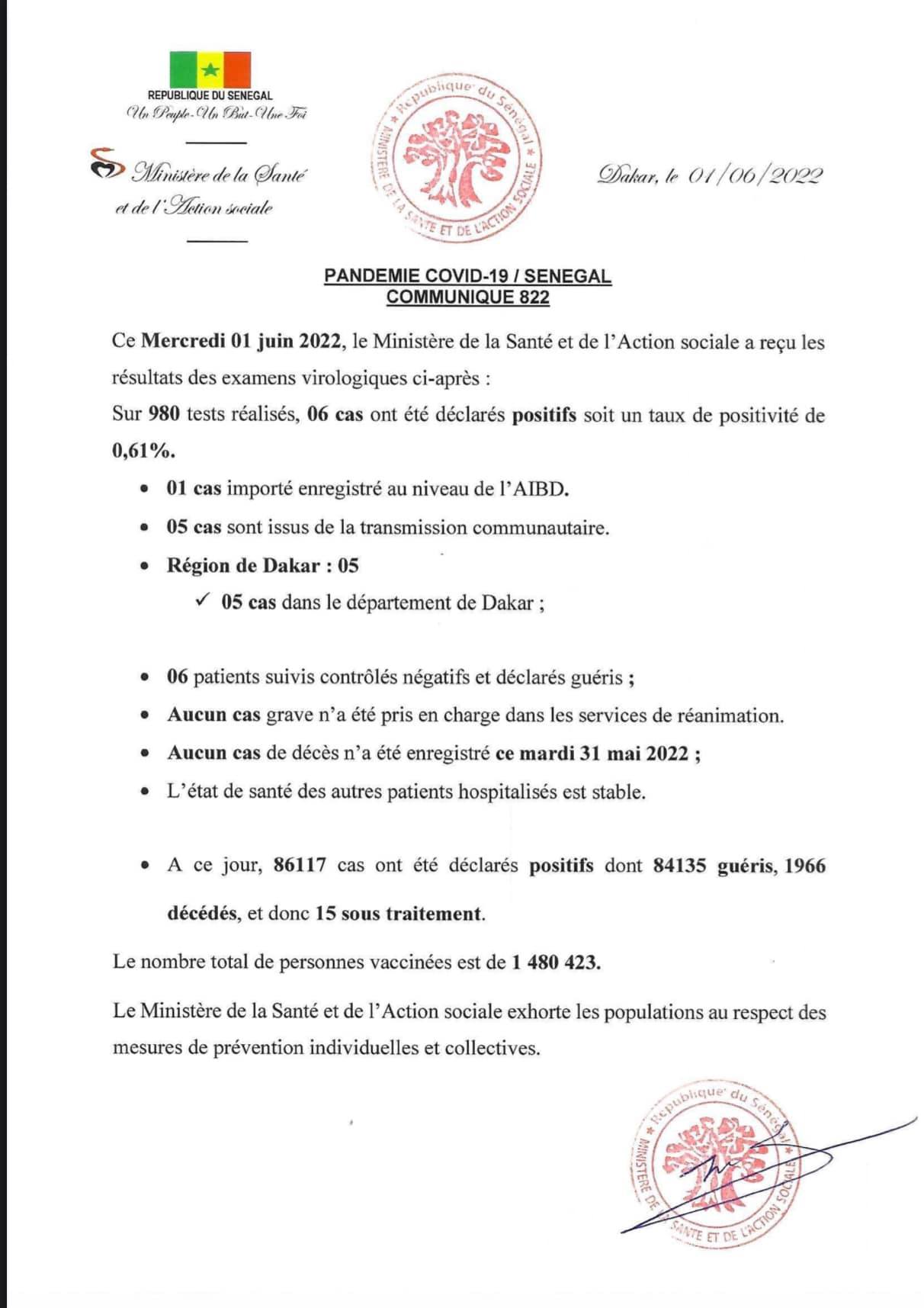Le ministère de la santé et de l’action sociale a fait le bilan de la pandémie de covid-19 au Sénégal, ce mercredi 1er juin 2022. Sur 980 tests effectués, six (6) sont revenus positifs au coronavirus. Les cas positifs se répartissent comme suit : un (1) cas contact, zéro (0) cas importé et cinq (5) cas issu de la transmission communautaire.
