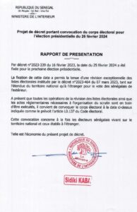 Le ministre de l’Intérieur Sidiki Kaba a rendu publique le projet de décret portant convocation du corps électoral. Le document signé le 29 novembre dernier stipule que : « les électeurs sénégalais établis sur le territoire national et ceux résidant à l’étranger sont convoqués le dimanche 25 février 2024 pour l’élection présidentielle.