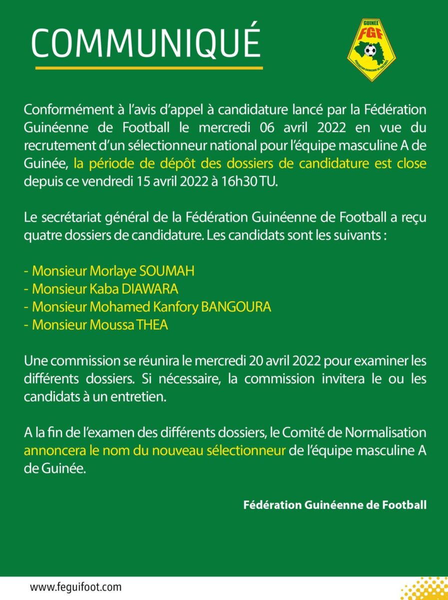 A la recherche d’un nouveau sélectionneur pour diriger le Syli National dans les éliminatoires de la CAN 2023, la Fédération guinéenne (Feguifoot) a annoncé ce vendredi, au terme de la clôture de son appel à candidatures, avoir reçu 4 dossiers. Ce faible total s’explique par l’exigence des critères retenus (notamment être de nationalité guinéenne).