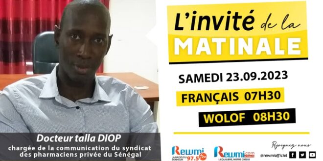 Votre émission Invité de la Matinale Reçoit Dr talla DIOP, Chargée de la communication du syndicat des pharmaciens privée du sénégal, Ce Samedi 23 Septembre 2023. Présentation: Ndeye Comba Moreau [Version Française] https://youtu.be/dJrt5YC2sNM