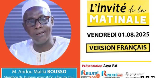 Votre émission Invité de la Matinale Reçoit M. Abdou Maliki BOUSSO, Membre du bureau exécutif du forum civil, Ce Vendredi 01 Aout 2025..Présentation: Awa BA [Version Française]