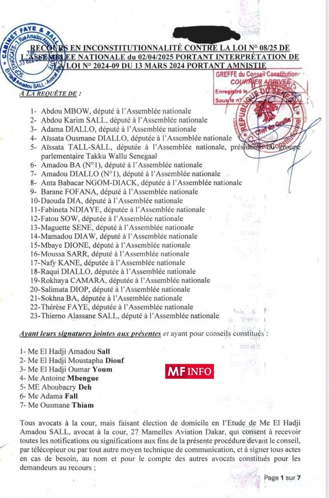 Assurant avoir pris toutes les précautions d’usage avec leurs conseillers constitués autour de Me Amadou Sall, pour procéder à ce recours dans les conditions fixées par la loi, Mbaye Dione et collègues parlementaires de l’opposition indiquent : « Il appartient au Conseil Constitutionnel, seul à même de dire le droit, de fixer le peuple au nom duquel cette dangereuse loi a été adoptée par la majorité mécanique de la représentation nationale. »