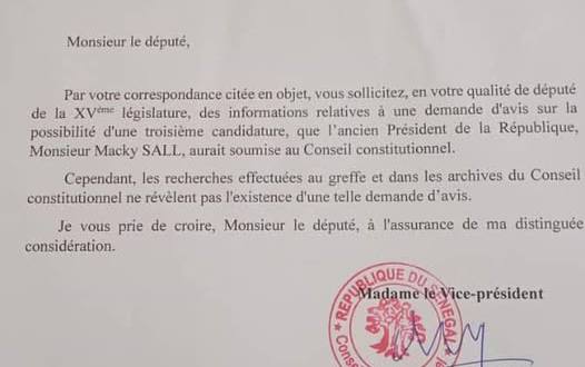 Saisi par le député du Pastef Amadou Ba qui voulait avoir des précisions sur une supposée demande d’avis de l’ex Président Macky Sall sur une possible troisième candidature, le Conseil constitutionnel indique n’avoir jamais été au courant d’une telle sollicitation. La Haute juridiction précise que les recherches effectuées au greffe et dans les archives ne révèlent pas l’existence d’une demande d’avis de Macky Sall sur une possible troisième candidature.